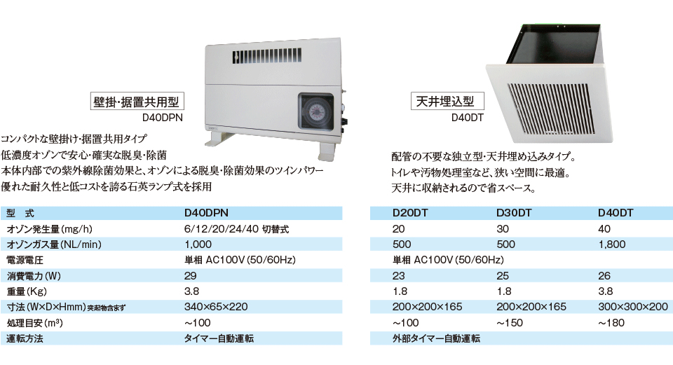 - 配管の不要な独立型・据置/壁掛または天井埋め込みタイプで、室内の脱臭に最適。